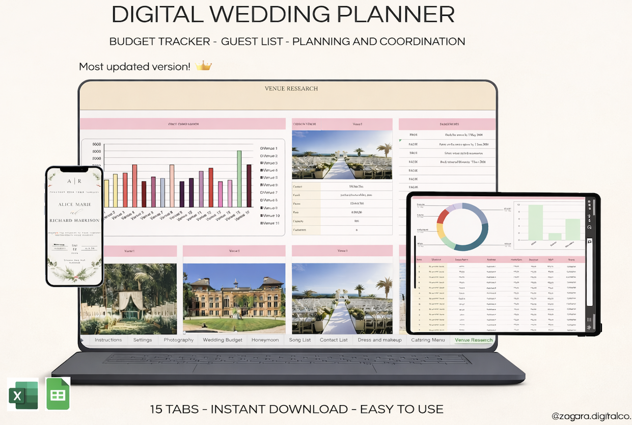 Track expenses, manage your guest list, RSVPs, and seating plan effortlessly with editable and intuitive dashboards.